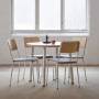 Rundt bord Add 590 med ben af stålrør Ø 50 mm, gulvbeskyttelse med detaljer. 33 mm bordplade belagt med højtrykslaminat og ABS-kantlister.I serien findes også rektangulære borde.