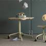 Bord Smile med bordplade i birk krydsfiner, belagt med linoleum og ABS-kantliste. Bordet kan fås med fast bordplade eller alternativt med sammenklappelig bordplade, så de er stabelbare. Hæve-sænkbar elevbord med gassøjler og med let rullende hjul i bagkanten, bordet er stabilt når frontben er nede på gulvet.