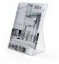 Holder i transparent plast med dobbelt anvendelse: Bordskilt: Et A5 ark kan indsættes bag. Brochureholder: Foran ryggen er plads til en mindre brochurer. Brochurestativet er "elastisk" til at holde brochure foran ryggen på plads. Leveres med skridsikre gummifødder. Minimum ordre to stykker. Mål: 150x227x85 (BxHxD)