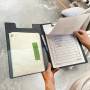 Med clips, penneholder og skrålomme på indersiden.Visitkortlomme på forsiden.Produceret i Pvc, pap og metal.