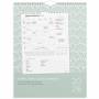 Familiekalender i karton til vægophæng. Vægkalenderen er spiralindbundet og har ugeopslag. Hver uge er opdelt i 5 kolonner, så hvert familiemedlem har sin egen kolonne og skriveplads til at notere aktiviteter og aftaler. Plads til ugens madplan for at lette madindkøb. Kalenderen har desuden af afrivbar del til fx indkøbs- huske- eller to-do-lister, en månedsoversigt på hvert ugeopslag og notatfelt samt en fødselsdagsoversigt.