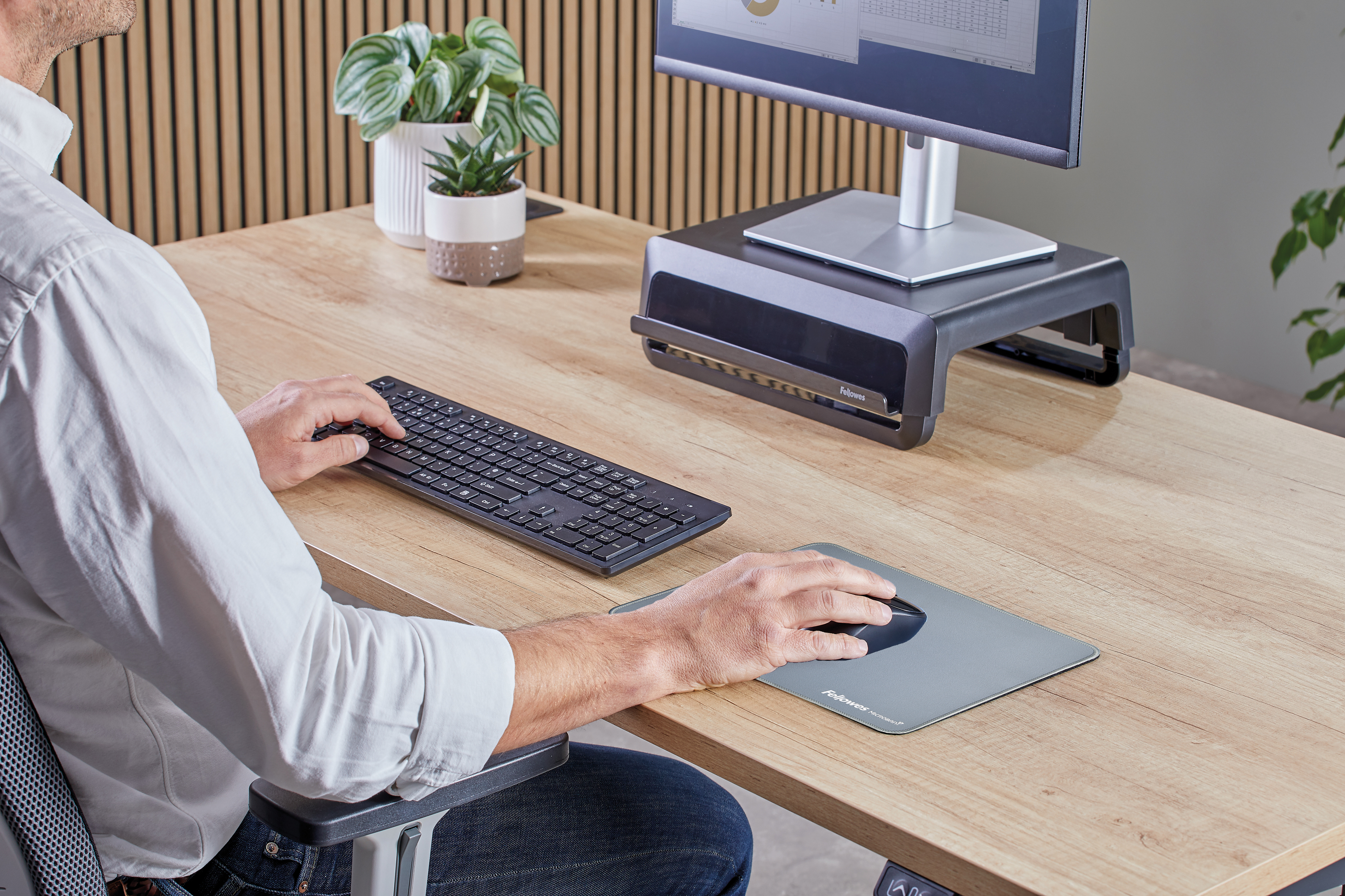 Fellowes Breyta XL-musemåtte i blå er over 25 % større end almindelige musemåtter for en mere naturlig og ergonomisk brug. Den reducerer små, gentagne bevægelser, der kan forårsage smerter i håndleddet, samtidig med at den giver bedre kontrol og præcision. Overfladen er optimeret til både optiske og laser-mus og sikrer glatte, præcise bevægelser hver gang. Den indbyggede Microban®-teknologi hæmmer bakterievækst og giver hygiejnisk beskyttelse døgnet rundt. Fremstillet af 83 % genanvendt materiale med skridsikker bund og slidstærke, flade kanter, der forhindrer slid og forlænger levetiden. En stilren og praktisk musemåtte med 5 års begrænset garanti. Mål H x B x D: 0,25 x 28 x 21cm