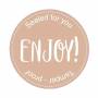 Giv jeres kunde en særlig stemning, med netop jeres kaffe, pizza, frokost to-go m.m. Forseglingsetiketter med mulighed for både at brande og forsegle din emballage på én gang – og så med en venlig hilsen fra dig/jer til din/jeres kunde. Med METOs forseglingsetiketter er emballagen forsvarligt forseglet. En fordel og sikkerhed/tryghed for din kunde. MetoSecure-forseglingsetiketter er forseglede etiketter med sikkerhedssnit. Den populære løsning til højkvalitets forsegling. Efter åbning af forseglingsetiketten, bliver manipulationen øjeblikkeligt genkendelig. MetoSecure-forseglingsetiketter rives over ved sikkerhedsperforeringen, når pakken åbnes. Når først etiketten er forsøgt åbnet/fjernet, kan emballagen ikke lukkes igen. Forseglingsetiketten er holdbar og selvklæbende og klæber sikkert og pålideligt på alle gængse emballager. Du kan også tilføre f.eks. dato, navn, nr. m.m. Perfekt til restaurantlevering, take-away, catering, madservice og pakkeforsendelser. Ideel til forsegling af pizzaæsker, papirposer, kopper, låg på drikkevarer og en række mad-beholdere/-emballage. BRCGS emballage og HACCP-certificeret etiket produktion (fødevare-godkendt emballage og etiket produktion) Etiketterne måler 50 mm i diameter. Der er 500 etiketter pr. dispenser, hvor hver etiket trækkes frem i takt med den bruges. Etiketten er brun med teksten ""Enjoy!"". (Inkl. tekst, der indikerer sikkerhedssnittet: ""Sealed for you"" og ""Tamper - proof"")." • Velegnet til branding på og lukning af emballage til mad og drikke • Til opsigtsvækkende og reklameeffektiv mærkning og etikettering • Ideel til forsegling af pizzaæsker, papirposer, kopper, drikkevarelåg og en række mad-beholdere/-emballage. • Sikker klæbeevne på alle gængse materialer • BRCGS emballage og HACCP-certificeret etiket produktion (fødevare-godkendt emballage
