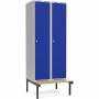 Garderobeskab 2x400mm m/lige tag, blå dør med greb for hængelås og siddebænk
