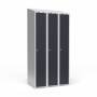 Helsvejst garderobeskab, 3x300 mm med skråt tag. 1 rum i højden, lys grå kabinet (RAL 7035) og antracit dør (RAL 7016), pulverlakeret stålplade. Levereres med færdigmonteret cylinderlås. Indretning er komplet med hattehylde samt bøjlestang og 2 stk. ankerkroge. Indbygget ventilation i skabets front, øverst og nederst. Totalmål (b x d x h) 900 x 550 x 1902 mm