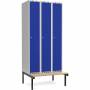 Garderobeskab 3x300mm m/lige tag, blå dør med cylinderlås og siddebænk