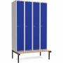 Garderobeskab 4x300mm m/lige tag, blå dør med cylinderlås og siddebænk