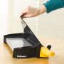 A4 guillotine skæremaskine med 'Protective SafeCut™ safety guard' for maximal sikkerhed som passer på et mindre kontor. Kan skære op til 10 ark (80g) ad gangen. Papirklemme minimerer at papirene flytter på sig under arbejdet. Angivede mål for dokumenter i forskellige størrelser. Cutting Length (mm): 320. Mål: 63,5 x 28,5 x 9,0 cm.