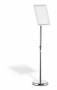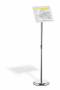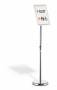 Gulvskilt med klikramme og forkromet teleskopstativ, der kan justeres fra 77 til 120 cm (i A4-format). Meget anvendelig på museer, udstillinger, receptioner og andre steder, hvor der skal vises information, som kan have behov for at blive udskiftet fra tid til anden. Skift dokumentet ved at folde alle 4 sideprofiler op og fjerne den UV-bestandige og antireflekterende plastfront, der beskytter materialet. Rammen er fremstillet af en anodiseret aluminiumprofil, hvilket gør aluminiumoverfladen mere holdbar. Informationsstanderens bagside er fremstillet af holdbart polystyren. Justerbar læsevinkel og kan drejes, så den kan placeres i stående eller liggende format. Rund fod (Ø 25 cm) med en gummiring på undersiden for at beskytte gulvet mod ridser. Foden kan også fyldes med 1,1 kg sand for ekstra stabilitet. Tilbehør: 1,5 kg sand, art.nr. 333516.