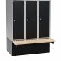 Høj sokkel med bænkkonsol til garderobeskabe med bredde 900 mm og dybde 550 mm. Sokkelhøjde er 320 mm, som lægges til skabets højde for at få en totalhøjde. Produceret af pulverlakeret metal. Farve sort RAL 9005. Siddebænk i birk højtrykslaminat. Total dybde er 865 mm.