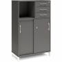 3A4 kontorskab i kontormøbelserien DNA, med 2A4 skydedør og skuffemodul, udvendig bredde x dybde x højde, 800 x 400 x 1275 mm, inkl. understel. Dette kontorskab leveres med antracit laminat kabinet i kombination med antracit laminat døre og skuffer, det hele på et flot hvidt understel, miljørigtig pulverlakeret.