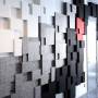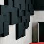Lydabsortbent Nivå EcoSUND - med sort kernemateriale uden tekstil-laminering - er en lydabsorbent som forbedrer akustikken betydelig. Med sit specielle formsprog, bidrager Lydabsortbent Nivå EcoSUND til et helt eget udtryk i dine lokaler.Panelerne som er ca 60 x 60 cm kan varieres for at lave mønstre i ulige farver; ved at kombinere de tre tilgængelige kernematerialer, måske nogle paneler lamineret med tekstilet Hush i forskellige farver - eller begge i kombination. Absorbenternes tykkelse varierer og hvert panel består af rektangler og kvadrater i tykkelse 30 til 90 mm. Ved hælp af den velour beklædte bagside fæstes panelerne let til væggen, ved hjælp af de medfølgende beslag.Det unikke kernemateriale EcoSUND er udviklet med tanke både på arbejdsmiljø og vore omgivelser - produceret i recirkuleret PET og godkendt iht OEKO-TEX standard 100. Det er helt fri for lim/bindemiddel og afgiver ingen gasser. Det afgiver heller ikke allergifremkallende fibre.