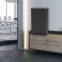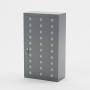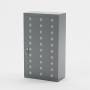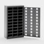 Mobilhotel i stål med cylinderlås. Skabet har 30 rum med plads til mobiltelefoner. Bunden i hvert rum er filtbelagt for at forhindre stødskader på mobilen. Hvert rum har Ø40 mm plexiglas for indsyn. Nummerering fra 1-30 markeret i plexiglas. Hel dør, så det er let at åbne op for læreren. Forberedt til vægmontering.