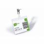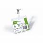 Navneskilt i tværformat med klemme på strop (seleclips). Navneskiltet hænger altid i den rigtige position idet at metalklemmen er drejelig. Ved fastgørelse og lukning af strop forsegler lommen, sikring af indstikket. Hul design tillader kombination med kæde, yoyo eller tekstil halsbånd. Indstik medfølger. Mål indstik: 60x90mm (HxB). Indstiksetiket på A4 ark til udskrivning i printer kan bestilles separat