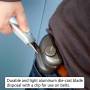 Beholder til brugte klinger med indbygget klingeholder, som gør det nemt og sikkert at knække og opbevare brugte klinger direkte i beholderen. Den er fremstillet af slidstærkt og let støbt aluminium. Udstyret med en praktisk clips til fastgørelse i bæltet - ideel til professionel brug, hvor sikkerhed og effektivitet er vigtig.