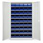 Opbevaringsskab ASPB model 1 er et kompletskab med plastkasser, bestående af det helsvejste stålskab ASHV med lysegrå døre og størrelse 1980 x 1200 x 470 mm, i kombination med nødvendig antal hylder og 45 stk blå modulbokse med d x b x h = 400 x 230 x 150 mm.Med opbevaringsskabet ASPB får du en låsbar og meget overskuelig opbevaring af dine smådele. Etiketter for opmærkning af kasserne medfølger. Ønsker du yderligere opdeling af kasserne, bestiller du i tillæg tilhørende deleplader. Kapacitet pr. hylde er 80 kg, jævnt fordelt.