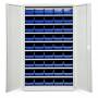 Opbevaringsskab ASPB model 1 er et kompletskab med plastkasser, bestående af det helsvejste stålskab ASHV med lysegrå døre og størrelse 1980 x 1200 x 570 mm, i kombination med nødvendig antal hylder og 45 stk blå modulbokse med d x b x h = 500 x 230 x 150 mm.Med opbevaringsskabet ASPB får du en låsbar og meget overskuelig opbevaring af dine smådele. Etiketter for opmærkning af kasserne medfølger. Ønsker du yderligere opdeling af kasserne, bestiller du i tillæg tilhørende deleplader. Kapacitet pr. hylde er 80 kg, jævnt fordelt.