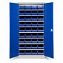 Opbevaringsskab ASPB model 1 er et kompletskab med plastkasser, bestående af det helsvejste stålskab ASHV med blå døre og størrelse 1980 x 980 x 670 mm, i kombination med nødvendig antal hylder og 36 stk blå modulbokse med d x b x h = 600 x 230 x 150 mm.Med opbevaringsskabet ASPB får du en låsbar og meget overskuelig opbevaring af dine smådele. Etiketter for opmærkning af kasserne medfølger. Ønsker du yderligere opdeling af kasserne, bestiller du i tillæg tilhørende deleplader. Kapacitet pr. hylde er 80 kg, jævnt fordelt.