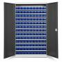 Opbevaringsskab ASPB model 2 er et kompletskab med plastkasser, bestående af det helsvejste stålskab ASHV med antracit døre og størrelse 1980 x 1200 x 470 mm, i kombination med nødvendig antal hylder og 130 stk lagerkasser med d x b x h = 400 x 115 x 100 mm.Med opbevaringsskabet ASPB får du en låsbar og meget overskuelig opbevaring af dine smådele. Etiketter for opmærkning af kasserne medfølger. Ønsker du yderligere opdeling af kasserne, bestiller du i tillæg tilhørende deleplader. Kapacitet pr. hylde er 80 kg, jævnt fordelt.