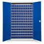 Opbevaringsskab ASPB model 2 er et kompletskab med plastkasser, bestående af det helsvejste stålskab ASHV med blå døre og størrelse 1980 x 1200 x 570 mm, i kombination med nødvendig antal hylder og 130 stk lagerkasser med d x b x h = 500 x 115 x 100 mm.Med opbevaringsskabet ASPB får du en låsbar og meget overskuelig opbevaring af dine smådele. Etiketter for opmærkning af kasserne medfølger. Ønsker du yderligere opdeling af kasserne, bestiller du i tillæg tilhørende deleplader. Kapacitet pr. hylde er 80 kg, jævnt fordelt.