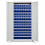Opbevaringsskab ASPB model 2 er et kompletskab med plastkasser, bestående af det helsvejste stålskab ASHV med lysegrå døre og størrelse 1980 x 980 x 670 mm, i kombination med nødvendig antal hylder og 104 stk lagerkasser med d x b x h = 600 x 115 x 100 mm.Med opbevaringsskabet ASPB får du en låsbar og meget overskuelig opbevaring af dine smådele. Etiketter for opmærkning af kasserne medfølger. Ønsker du yderligere opdeling af kasserne, bestiller du i tillæg tilhørende deleplader. Kapacitet pr. hylde er 80 kg, jævnt fordelt.