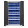 Opbevaringsskab ASPB model 3 er et kompletskab med plastkasser, bestående af det helsvejste stålskab ASHV med antracit døre og størrelse 1980 x 980 x 670 mm, i kombination med nødvendig antal hylder og 52 stk lagerkasser med d x b x h = 600 x 230 x 100 mm.Med opbevaringsskabet ASPB får du en låsbar og meget overskuelig opbevaring af dine smådele. Etiketter for opmærkning af kasserne medfølger. Ønsker du yderligere opdeling af kasserne, bestiller du i tillæg tilhørende deleplader. Kapacitet pr. hylde er 80 kg, jævnt fordelt.