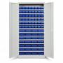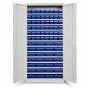Opbevaringsskab ASPB model 4 er et kompletskab med plastkasser, bestående af det helsvejste stålskab ASHV med lysegrå døre og størrelse 1980 x 980 x 570 mm, i kombination med nødvendig antal hylder, 48 stk lagerkasser med størrelse 500 x 115 x 100 mm og 28 stk lagerkasser med størrelse 500 x 230 x 100 mm.Med opbevaringsskabet ASPB får du en låsbar og meget overskuelig opbevaring af dine smådele. Etiketter for opmærkning af kasserne medfølger. Ønsker du yderligere opdeling af kasserne, bestiller du i tillæg tilhørende deleplader. Kapacitet pr. hylde er 80 kg, jævnt fordelt.