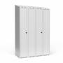 Helsvejst parskab/dobbeltskab, 300+300 mm med skråt tag. 4-søjlet med parvis lås, lys grå kabinet (RAL 7035) og lys grå dør (RAL 7035), pulverlakeret stålplade. Levereres med færdigmonteret cylinderlås. Indretning er komplet med hattehylde samt bøjlestang og 2 stk. ankerkroge. Indbygget ventilation i skabets front, øverst og nederst. Totalmål (b x d x h) 1200 x 550 x 1902 mm
