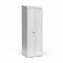 Helsvejst parskab/dobbeltskab, 300+300 mm med skråt tag. 2-søjlet med parvis lås, lys grå kabinet (RAL 7035) og lys grå dør (RAL 7035), pulverlakeret stålplade. Levereres med færdigmonteret cylinderlås. Indretning er komplet med hattehylde samt bøjlestang og 2 stk. ankerkroge. Indbygget ventilation i skabets front, øverst og nederst. Totalmål (b x d x h) 600 x 550 x 1902 mm