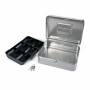 Mindre grå pengekasse i formstøbt stål med håndtag og møntbakke i plast med 6 rum. Cylinderlås og to medfølgende nøgler. Mål: 152x115x80mm