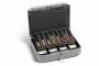 • Elegant og stabil pengekasse af metal • Inkl. udtageligt tællebræt med 8 riller til alle cent- og euromønter, rille til midlertidig opbevaring af pengesedler og en bakke med 4 rum til pengesedler • Med nedklappeligt, ergonomisk formet bærehåndtag • Den buede bund giver mulighed for stabling af flere kassetter • Absolut sikkerhed ved hjælp af tætsluttende låg, skjulte hængsler og lås med dobbeltlukkende krogrigel • Sikker og problemfri bestilling af reservenøgler takket være individuelt nøglenummer • Møntkapacitet: 233,90 euro • Vægt: ca. 4 kg