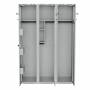 Kombination D består af 3 skabssektioner, hver med en bredde på 400 mm.Den venstre sektion har hattehylde med tøjstang og fire ophængskroge samt tre hylder i døren. Venstrehængt dør med dørknop.Sektionen i midten har hattehylde med tøjstang og to ophængskroge samt to lodrette rum med tøjstang og to ophængskroge. Højrehængt dør forberedt til lås.Den højre sektion er et garderobeskab indrettet med hattehylde, tøjstang og fire ophængskroge. Højrehængt dør forberedt til lås.Til dette skab kan du vælge overskab og alle standard understel med 1200 mm bredde, samt Eurolock og ASSA cylinderlås eller greb til hængelås.PR2 er økonomiversionen af vores PRO-skabe, leveret med T01 enkel ståldør og enkle tøjkroge ophængt på et ovalt ophængsrør. Lang tøjkrog på ydersiden af dørene og en kort på indvendig side af dørene.
