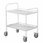 Hvid bordvogn / serveringsvogn med 2 stk 510 x 710 mm hylder. Kraftig understel i stål og 10 mm limet laminatplade. Kapaciteten er 150 kg jævnt fordelt (75 kg pr. hylde). Afstand mellem hylderne er 355 mm. Leveres usamlet inkl. 4 drejelige gummihjul, heraf 2 med bremse.