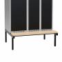 Siddebænk med birk laminat med en bredde på 1000 mm og en dybde på 550 mm. Siddebænken leveres med justerskruer til ujævne gulve, i sortlakeret udførelse med birk, og monteres nemt. Siddebænken har en højde på 320 mm, som kommer oveni skabets højde.Understellet er tilpasset skabe med en dybde på 550 mm og en bredde på 1000 mm, og er beregnet til ét skab placeret i en enkelt række.