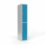 Skoleskab, helsvejst 1x300 med lige tag. 2 rum i højden. Lys grå kabinet (RAL 7035) med pulverlakeret ståldør lys blå (RAL 5012). Leveres med færdigmonteret greb for hængelås ASSA 3906. Totalmål (b x d x h) 300 x 550 x 1750 mm.