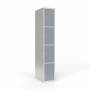 Skoleskab, helsvejst 1x300 med lige tag. 4 rum i højden. Lys grå kabinet (RAL 7035) med pulverlakeret ståldør grå (RAL 7040). Leveres med færdigmonteret cylinderlås ASSA 8450 H. Totalmål (b x d x h) 300 x 550 x 1750 mm.