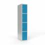 Skoleskab, helsvejst 1x300 med lige tag. 4 rum i højden. Lys grå kabinet (RAL 7035) med pulverlakeret ståldør lys blå (RAL 5012). Leveres med færdigmonteret greb for hængelås ASSA 3906. Totalmål (b x d x h) 300 x 550 x 1750 mm.
