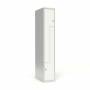 Skoleskab, helsvejst 1x300 med lige tag. Z-døre. Lys grå kabinet (RAL 7035) med pulverlakeret ståldør hvid (RAL 9003). Leveres med færdigmonteret greb for hængelås ASSA 3906. Indretningen består af to hylder, en garderobestang med to ankerkroge pr. rum. Totalmål (b x d x h) 300 x 550 x 1750 mm