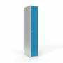 Skoleskab, helsvejst 1x400 med lige tag. 1 rum i højden. Lys grå kabinet (RAL 7035) med pulverlakeret ståldør lys blå (RAL 5012). Leveres med færdigmonteret cylinderlås ASSA 8450 H. ASSA H8450 Totalmål (b x d x h) 400 x 550 x 1750 mm.