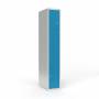 Skoleskab, helsvejst 1x400 med lige tag. Z-døre. Lys grå kabinet (RAL 7035) med pulverlakeret ståldør lys blå (RAL 5012). Leveres med færdigmonteret cylinderlås ASSA 8450 H. Indretningen består af to hylder, en garderobestang med to ankerkroge pr. rum. Totalmål (b x d x h) 400 x 550 x 1750 mm