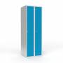 Skoleskab, helsvejst 2x300 med lige tag. 1 rum i højden. Lys grå kabinet (RAL 7035) med pulverlakeret ståldør lys blå (RAL 5012). Leveres med færdigmonteret greb for hængelås ASSA 3906. Totalmål (b x d x h) 600 x 550 x 1750 mm.