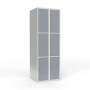 Skoleskab, helsvejst 2x300 med lige tag. 3 rum i højden. Lys grå kabinet (RAL 7035) med pulverlakeret ståldør grå (RAL 7040). Leveres med færdigmonteret greb for hængelås ASSA 3906. Totalmål (b x d x h) 600 x 550 x 1750 mm.