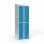 Skoleskab, helsvejst 2x300 med skråt tag. 2 rum i højden. Lys grå kabinet (RAL 7035) med pulverlakeret ståldør lys blå (RAL 5012). Leveres med færdigmonteret cylinderlås ASSA 8450 H. Totalmål (b x d x h) 600 x 550 x 1900 mm.