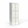 Skoleskab, helsvejst 2x300 med skråt tag. 3 rum i højden. Lys grå kabinet (RAL 7035) med pulverlakeret ståldør hvid (RAL 9003). Leveres med færdigmonteret greb for hængelås ASSA 3906. Totalmål (b x d x h) 600 x 550 x 1900 mm.