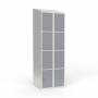 Skoleskab, helsvejst 2x300 med skråt tag. 4 rum i højden. Lys grå kabinet (RAL 7035) med pulverlakeret ståldør grå (RAL 7040). Leveres med færdigmonteret greb for hængelås ASSA 3906. Totalmål (b x d x h) 600 x 550 x 1900 mm.