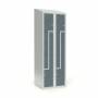 Skoleskab, helsvejst 2x300 med skråt tag. Z-døre. Lys grå kabinet (RAL 7035) med laminatdør VirrVarr Black (F6945). Leveres med færdigmonteret cylinderlås ASSA 8450 H. Indretningen består af to hylder, en garderobestang med to ankerkroge pr. rum.Totalmått (b x d x h) 600 x 550 x 1900 mm. FSC Certificeret materiale.