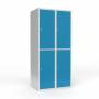 Skoleskab, helsvejst 2x400 med lige tag. 2 rum i højden. Lys grå kabinet (RAL 7035) med pulverlakeret ståldør lys blå (RAL 5012). Leveres med færdigmonteret greb for hængelås ASSA 3906. Totalmål (b x d x h) 800 x 550 x 1750 mm.