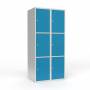 Skoleskab, helsvejst 2x400 med lige tag. 3 rum i højden. Lys grå kabinet (RAL 7035) med pulverlakeret ståldør lys blå (RAL 5012). Leveres med færdigmonteret cylinderlås ASSA 8450 H. Totalmål (b x d x h) 800 x 550 x 1750 mm.