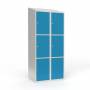 Skoleskab, helsvejst 2x400 med skråt tag. 3 rum i højden. Lys grå kabinet (RAL 7035) med pulverlakeret ståldør lys blå (RAL 5012). Leveres med færdigmonteret greb for hængelås ASSA 3906. Totalmål (b x d x h) 800 x 550 x 1900 mm.