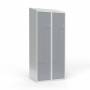 Skoleskab, helsvejst 2x400 med skråt tag. Z-døre. Lys grå kabinet (RAL 7035) med pulverlakeret ståldør grå (RAL 7040). Leveres med færdigmonteret cylinderlås ASSA 8450 H. Indretningen består af to hylder, en garderobestang med to ankerkroge pr. rum. Totalmål (b x d x h) 800 x 550 x 1900 mm